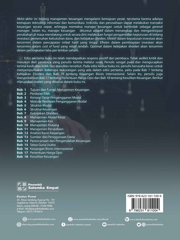 Edisi pertama buku ini telah mendapatkan respons positif dari pembaca. Tidak sedikit kritik dan masukan dari pembaca yang penulis terima melalui surel. Penulis sangat puas dan mengucapkan terima kasih atas kritik dan masukan tersebut. Pada edisi kedua buku ini, penulis berusaha keras untuk menyempurnakan beberapa kekurangan yang ada dalam edisi pertama, yaitu pada Bab 7 tentang Kebijakan Dividen dan Bab 16 tentang Keuangan Bisnis Internasional. Selain itu, penulis juga menambahkan Bab 17 tentang Penentuan Harga Opsi dan Bab 18 tentang Kesulitan Keuangan.