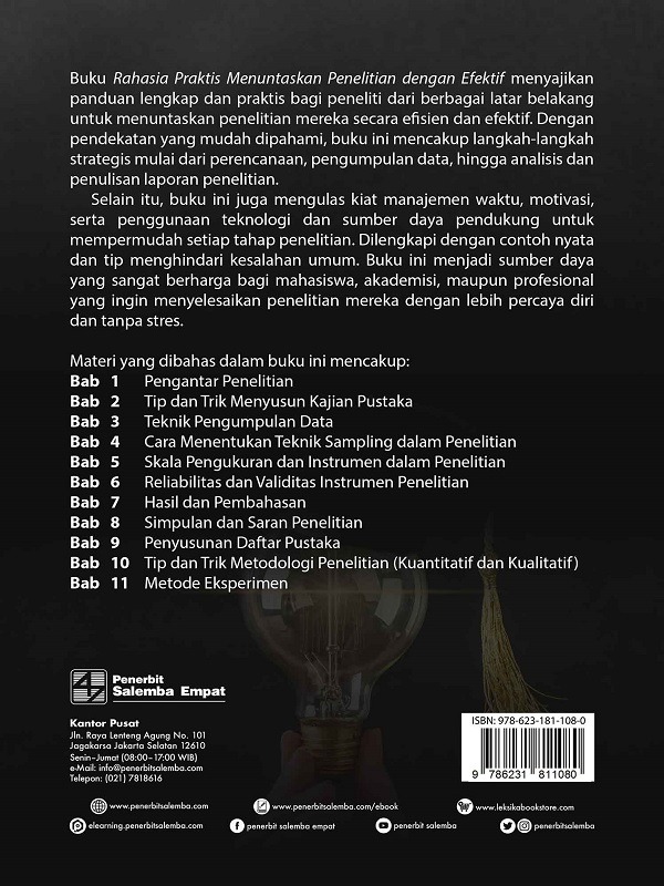 Buku Rahasia Praktis Menuntaskan Penelitian dengan Efektif menyajikan panduan lengkap dan praktis bagi peneliti dari berbagai latar belakang untuk menuntaskan penelitian/riset mereka secara efisien dan efektif. Dengan pendekatan yang mudah dipahami, buku ini mencakup langkah-langkah strategis mulai dari perencanaan, pengumpulan data, hingga analisis dan penulisan laporan penelitian.
